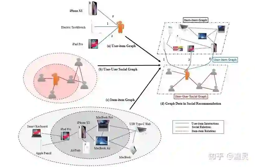 你想,用户-项目可以构成二部图(Bipartite Graph),用户与用户之间可以构成社交网络(Social Network),项目与项目之间可以存在知识图谱(Knowledge Graph),另外把这几者都考虑进去可以构成异质图(Heterogeneous Information Network),再把时间因素考虑进来而产生的动态演化而构成动态图(Dynamic Graph)。