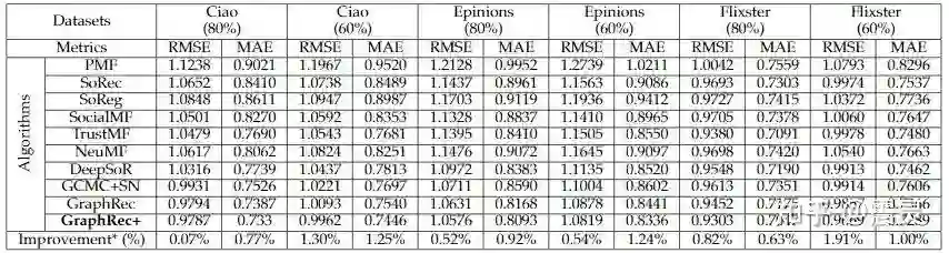 最终,作者将GraphRec+算法应用在了三个推荐系统测试数据集上,从下面展示的实验结果来看,融合了多类信息的GraphRec+算法可以取得最佳的性能。