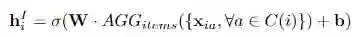 GraphRec+算法的第一步是将用户和商品之间的历史行为记录视为一个带权图,使用GNN进行建模。形式化定义如下所示,即对于用户相关联的商品,使用聚合函数对商品的Embedding进行聚合,最终得到用户的特征向量。