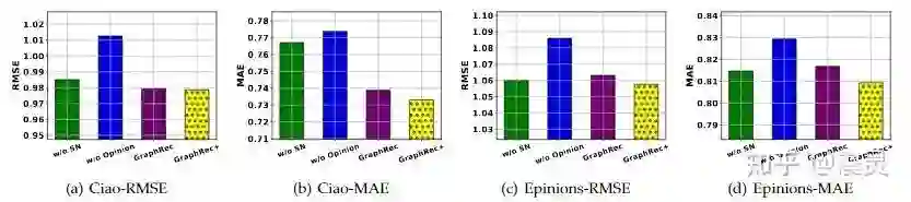 当然,这篇文章最有价值的部分还是作者做了充分的消融实验,证明了融合社交关系(w/o SN),融合用户评分(w/o Opinion),融合商品关系(GraphRec)的效果。具体消融实验结果见下图,从图中可以看到,社交关系、用户评分、商品关系均是GraphRec+取得良好预测性能的必要组件。