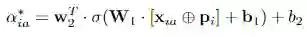 注意力分数即为用户特征和包含观点信息的商品特征进行拼接后,经过两层神经网络得到的值。
