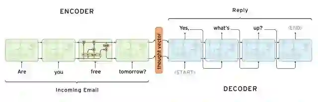 图中展示的是一个用于自动回复邮件的模型,它的编码器和解码器分别由四层RNN的变种LSTM[5]组成。图中的向量thought vector编码了输入文本信息(Are you free tomorrow?),解码器获得这个向量依次解码生成目标文本(Yes, what's up?)。上述模型也可以自然地用于自动文本摘要任务,这时的输入为原文本(如新闻),输出为摘要(如新闻标题)。