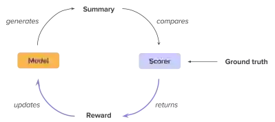 那么我们是怎么通过强化学习使模型针对ROUGE进行优化呢?简单说来,模型先以前向模式(inference)生成摘要样本,用ROUGE指标测评打分,得到了对这个样本的评价/回报(reward)后,再根据回报更新模型参数:如果模型生成的样本reward较高,那么鼓励模型;如果生成的样本评价较低,那么抑制模型输出此类样本。
