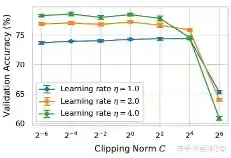 这篇文章前两个贡献其实非常 empirical,也很难深挖。而最后一个贡献很有意思 我仔细看了看超参数的 ablation study 发现一个原作者没有发现的点:在 clipping threshold 足够小的时候,其实 clipping threshold(也就是 clipping norm C,在上面的公式中和 R 是一个变量)没有作用。