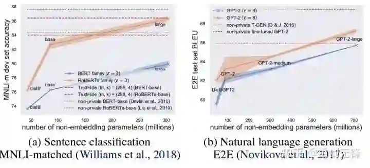 2. 在语言模型上,模型越大,性能会越好。比如 GPT2 从 4 亿参数到 8 亿参数性能提升很明显,也取得了很多 SOTA。(但是在 CV 和推荐系统中,很多时候更大的模型性能会很差,甚至接近 random guess。比如 CIFAR10 的 DP best accuracy 此前是由四层 CNN 得到的,而非 ResNet。)