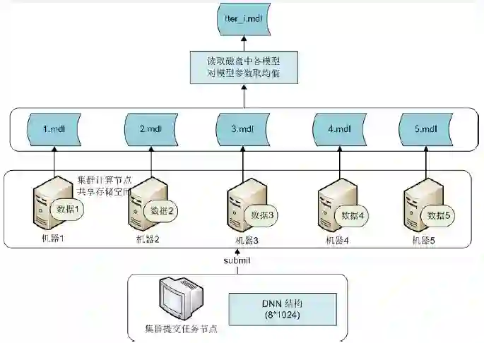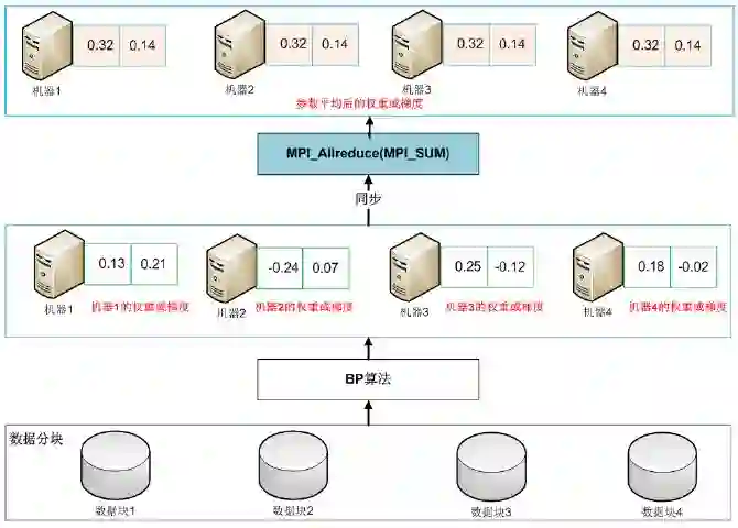 同步随机梯度下降(MPI):多进程训练,每个进程训练结束后将参数在服务器上平均后对所有进程重新同步,其他机器在这个新的参数基础上训练。该方法实现难度适中,模型参数在内存中进行同步和操作,训练速度快,精度损失较小。但一旦某台机器模型训练失败,所有机器需从头开始训练。