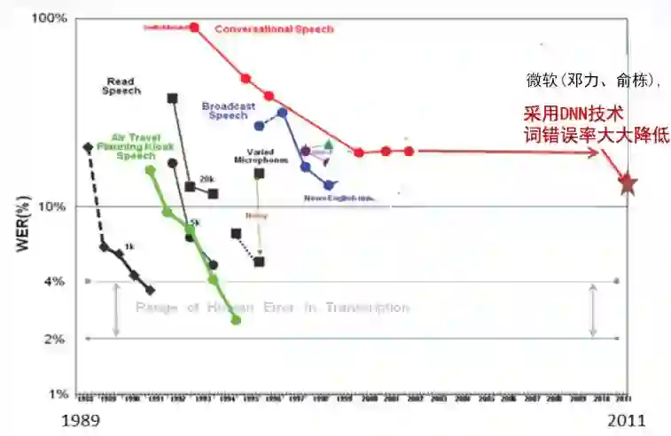 90年代到2000年初,神经网络进入冬天。Hinton在2006年提出的DBN(Deep Belief Network)成为新的发展和契机。深度神经网络在语音方面真正被重视是在2011年,微软学者俞栋实现用深度神经网络做语音识别的工作。这是深度神经网络第一个成功的应用,使用不同类型的训练集和测试集,识别词错误率均稳定相对降低了20%-30%,引起巨大轰动。谷歌随即也开展了这一工作。