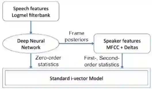 说话人识别中的经典方法是I-Vector,I-Vector建模方式称为全局差异空间建模(Total Variability Modeling, TVM),采用该方法提取的I-Vector记为TVM-I-Vector。在基于TVM-I-Vector的声纹识别系统中,我们一般可以分为三个步骤。第一步是统计量的提取,第二步是提取I-Vector,第三步是进行信道补偿技术。统计量的提取是指将语音数据的特征序列,比如MFCC特征序列,用统计量来进行描述,提取的统计量属于高维特征,然后经过TVM建模,投影至低维空间中得到I-Vector。在TVM-I-Vector建模中,统计量的提取是以UBM为基础的,根据UBM的均值及方差进行相应统计量的计算。基于DNN的说话人识别的基本思想是取代TVM中的UBM产生帧级后验概率。即采用DNN进行帧级对齐的工作,继而计算训练数据的统计量,进行全局差异空间的训练以及I-Vector的提取。目前没有详细证据证明深度神经网络或组合i-vector的深度神经网络性能一定优于i-vector方法,可能原因是说话人识别中信道干扰较多,难以搜集足够数据训练深度神经网络。。