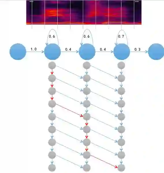 最上方为输入语音的语谱图,将语音第一帧代入一个状态进行计算,得到出现概率,同样方法计算每一帧的出现概率,图中用灰色点表示。灰色点间有转移概率,据此可计算最优路径(图中红色箭头),该路径对应的概率值总和即为输入语音经HMM得到的概率值。如果为每一个音节训练一个HMM,语音只需要代入每个音节的模型中算一遍,哪个得到的概率最高即判定为相应音节,这也是传统语音识别的方法。出现概率采用GMM,具有训练速度快、模型小、易于移植到嵌入式平台等优点,但缺点是没有利用帧的上下文信息,缺乏深层非线性特征变化的内容。GMM代表的是一种概率密度,它的局限在于不能完整模拟出或记住相同音的不同人间的音色差异变化或发音习惯的变化。