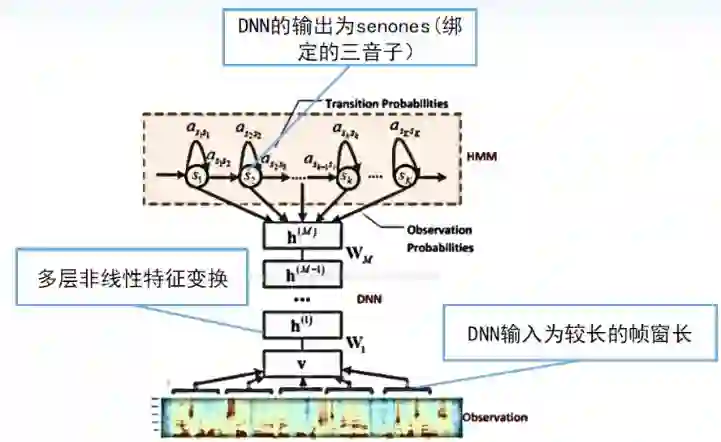 目前提到的深度神经网络依然和HMM进行了结合,仅仅把GMM替代了。它的训练过程还要依赖于传统的GMM-HMM的强制对齐信息,即利用GMM-HMM对每帧语音打一个标签,再利用这种有标签的数据训练深度神经网络,但这种方式依然是目前性能最好的方法之一。