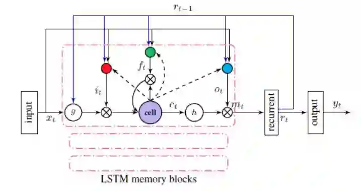深度循环神经网络-隐马尔科夫模型(RNN-HMM):如上所述,单纯用深层神经网络没有历史信息来辅助当前任务,所以提出RNN-HMM模型。RNN增加了时间的反馈,能够有效的利用时间的历史信息,将历史信息持久化,在很多任务上性能表现优于DNN,尤其是针对语音,因为语音具有很强的时序概念。但RNN随层数的增加会出现梯度爆炸或梯度消失,难以训练。也有人将长短时记忆模型LSTM融入RNN,LSTM采用一些控制门(输入门、遗忘门和输出门)来减少梯度累计的长度,一定程度上解决了RNN训练时的梯度消失和扩散的问题。RNN是迄今为止语音识别最好的模型之一,它的变体LSTM和BLSTM的性能都是相对最好的。