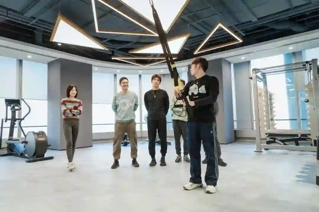 公司的健身房,同事们在尝试 TRX。