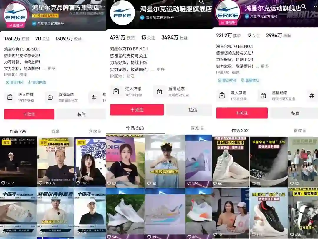 以鸿星尔克粉丝量最高的三个账号为例,比起直播间数据,短视频方面显得“十分惨淡”。