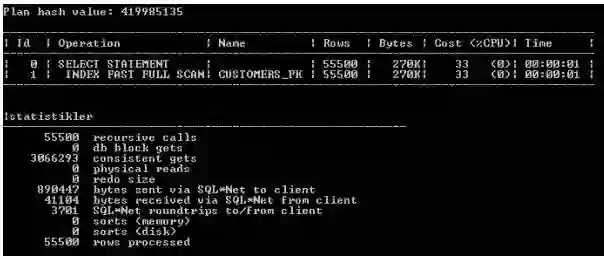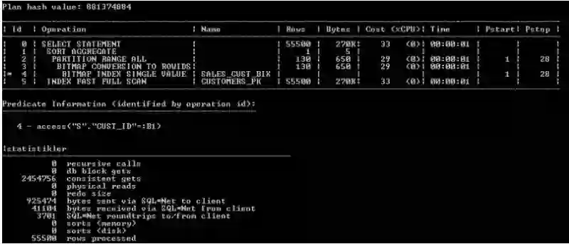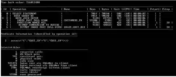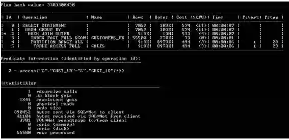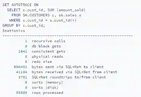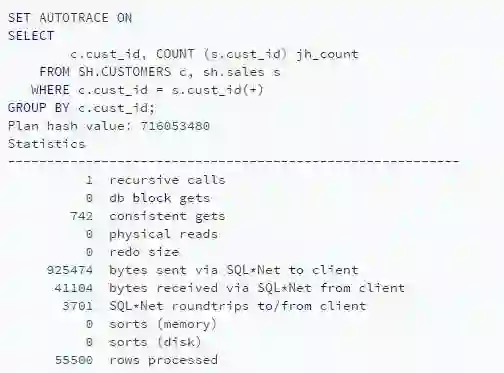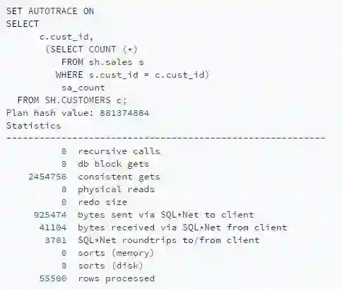 可以看到在两个查询的consistent gets数量之间的差异(当检查缓冲区缓存读到的块数据时)是巨大的。使用两种不同方法编写的查询在运行时导致不同时间。这种差别可以用性能来解释。