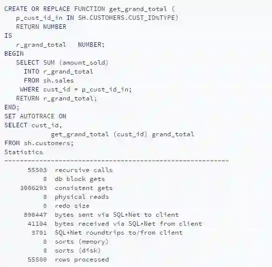在另一个例子中,常见的习惯是在SQL语句中调用PL/SQL函数。作为过程式工作的例子,也是一种解决问题的方法。还有其他一些影响在SQL内调用PL/SQL代码性能的不利因素,但在本文中,不会提到性能问题。