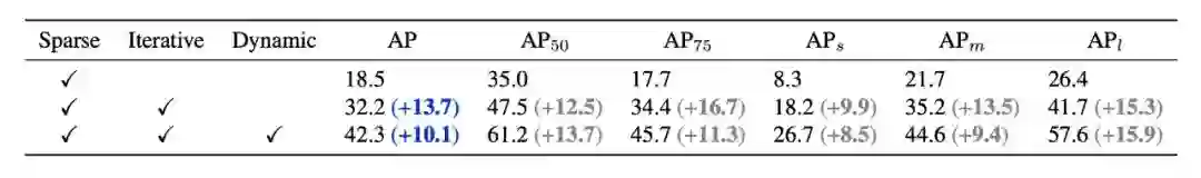 从 Faster R-CNN(40.2 AP) 出发,直接将 RPN 替换为 a sparse set of learnable proposal boxes,AP 降到 18.5;引入 iterative 结构提升 AP 到 32.2;引入 dynamic instance interaction 最终提升到 42.3 AP。