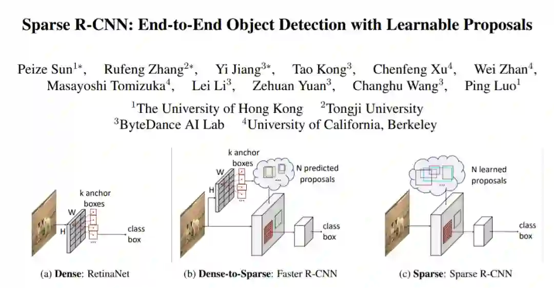 沿着目标检测领域中 Dense 和 Dense-to-Sparse 的框架,Sparse R-CNN 建立了一种彻底的 Sparse 框架, 脱离 anchor box,reference point,Region Proposal Network(RPN) 等概念,无需 Non-Maximum Suppression(NMS) 后处理
