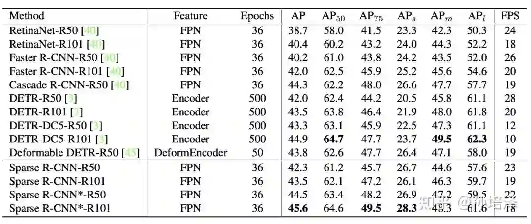 R-CNN 和 Fast R-CNN 出现后的一段时期内,目标检测领域的一个重要研究方向是提出更高效的 region proposal generator。Faster R-CNN 和 RPN 作为其中的佼佼者展现出广泛而持续的影响力。Sparse R-CNN 首次展示了简单的一组可学习的参数作为 proposal boxes 即可达到 comparable 的性能。我们希望我们的工作能够带给大家一些关于 end-to-end object detection 的启发。