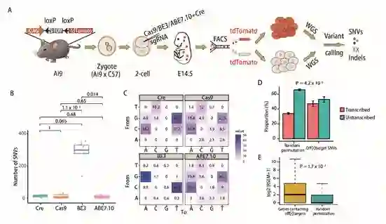 图1 GOTI技术的原理及实验流程:(A) 实验流程. (B) 脱靶位点数目比较。Cre-, Cas9-, BE3- and ABE7.10组分别有14+/-12 (SEM, n=2),12+/-4 (SEM, n=11),283+/-32 (SEM, n=6)和10 +/- 5 (SEM, n = 4)个SNVs。(C) 突变类型的分布比较. 每个格子中的数字表示该种突变类型占全部突变的比例 (D) 脱靶SNVs富集在基因组中的转录区域。(E) Genes 包含脱靶位点的基因在细胞胚胎中有更高的表达量。