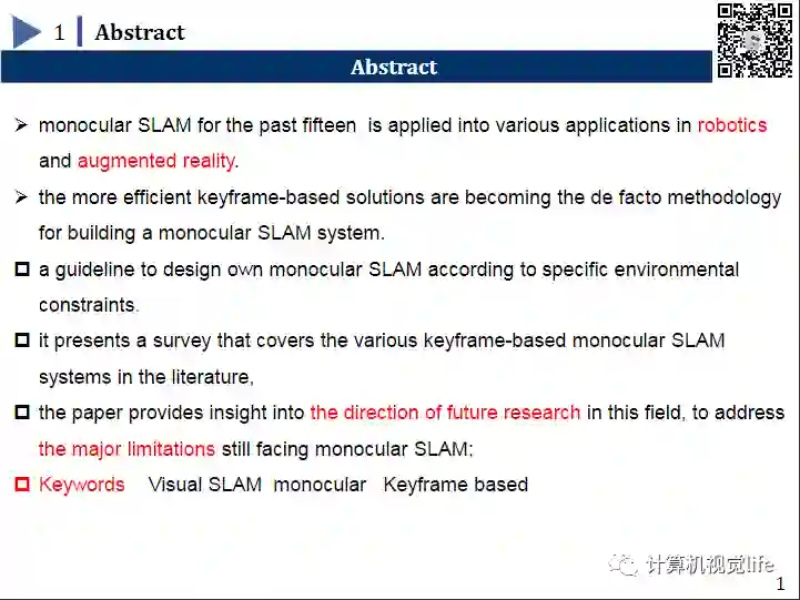 内容:带读SLAM经典论文《Keyframe-based monocular SLAM: design, survey, and future directions》