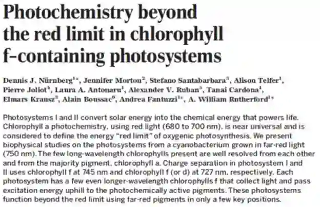 据海莉·邓宁(Hayley Dunning)报道,英国、法国、意大利以及澳大利亚的研究人员合作发现了一种新型的光合作用——靠近红外光进行光合作用,相关研究成果于2018年6月15日在《科学》(Science)杂志网站发表——