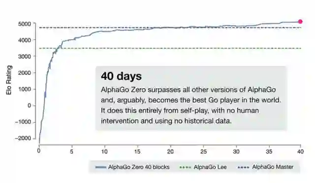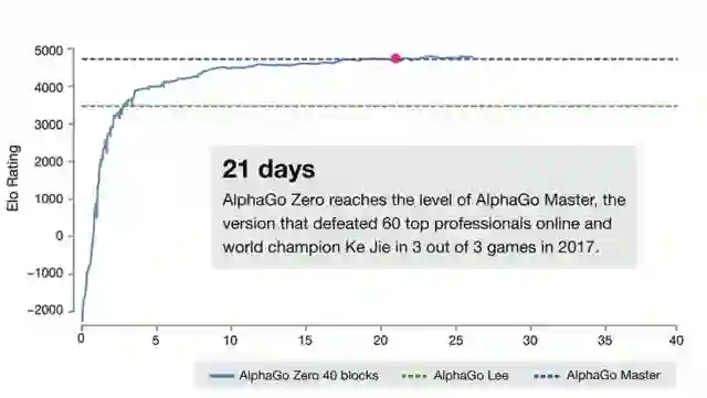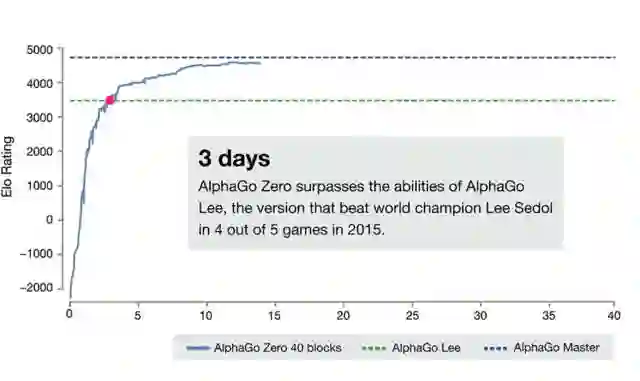 在进行了3天的自我训练后,AlphaGo Zero 在100局比赛中以100:0击败了上一版本的 AlphaGo——而上一版本的 AlphaGo 击败了曾18次获得围棋世界冠军的韩国九段棋士李世乭。经过 40 天的自我训练后,AlphaGo Zero 变得更加强大,超越了“Master”版本的 AlphaGo——Master 曾击败世界上最优秀的棋士、世界第一的柯洁。