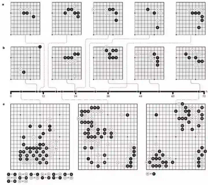 AlphaGo Zero学到的知识。a,AlphaGo Zero训练期间发现的五个人类定式(常见的角落序列)。b)自我对弈中爱用的5个定式。c)在不同训练阶段进行的3次自我对弈的前80步棋,每次搜索使用1,600次模拟(约0.4s)。最开始,系统关注夺子,很像人类初学者。而后,关注势和地,也即围棋根本。最后,整场比赛体现出了很好的平衡,涉及多次战斗和一场复杂的战斗,最终以白棋多半子获胜。