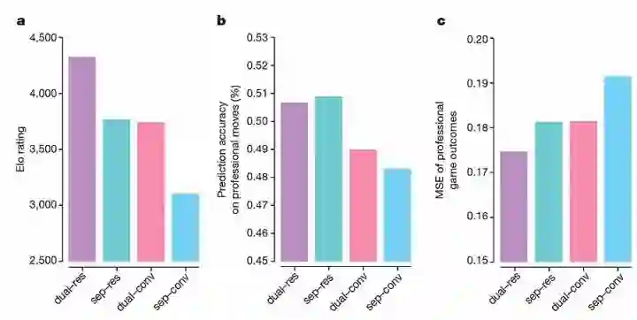 图4:AlphaGo Zero 和 AlphaGo Lee 的神经网络架构比较。使用分开的策略和价值网络记为(sep),使用组合的策略和价值网络记为(dual),使用卷积网络记为(conv),使用残差网络记为(res)。“dual-res”和“sep-conv”分别表示在 AlphaGo Zero 和 AlphaGo Lee 中使用的神经网络架构。每个网络都在同一个数据集上训练,该数据集由 AlphaGo Zero 的自我对弈产生。a,每个训练好的网络都与 AlphaGo Zero 的搜索相结合,以得到一个不同的玩家。Elo等级分是由这些不同玩家之间的评估游戏计算得到的,每一步棋有5秒的思考时间。b,对每个网络架构的职业棋手的走法(从GoKifu数据集得来)的预测准确性。c,每个网络架构的人类职业棋手的棋局结果(从GoKifu数据集得来)的MSE。
