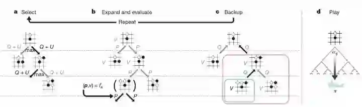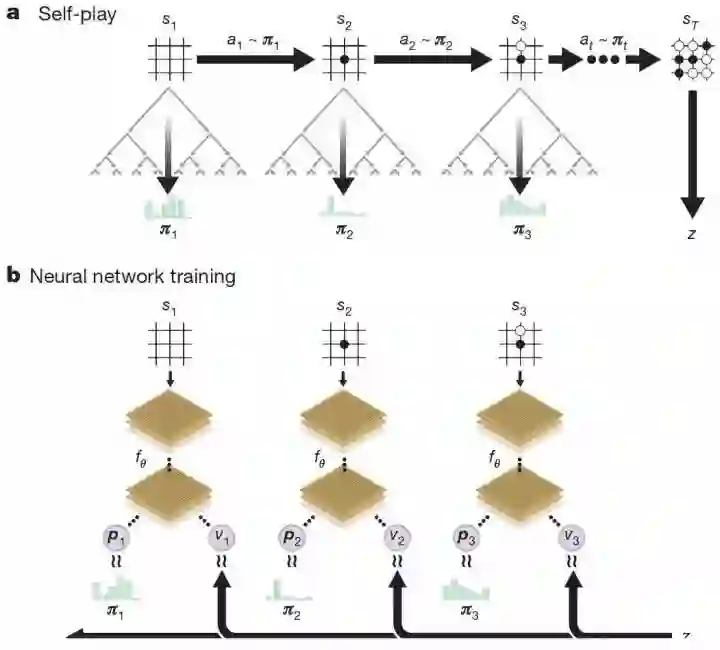 系统通过搜索进行自我对弈,也即使用增强的基于 MCTS 的策略选择下哪步棋,然后使用获胜者 z 作为价值样本,这个过程可以被视为一个强有力的策略评估 operator。
