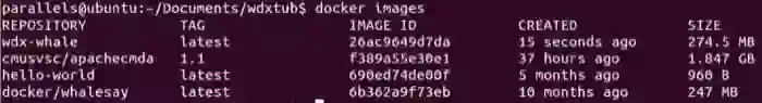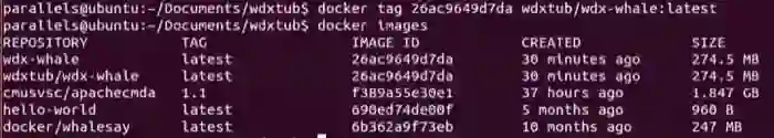记住我们的 IMAGE ID 26ac9649d7da。用以下命令打 tag docker tag 26ac9649d7da wdxtub/wdx-whale:latest,然后再 docker images 一次: