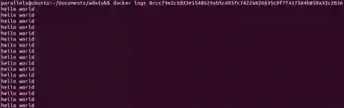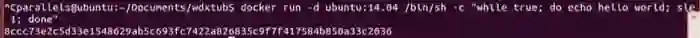 如果使用了 -d 参数运行容器 docker run -d ubuntu:14.04 /bin/sh -c "while true; do echo hello world; sleep 1; done",则显示是这样: