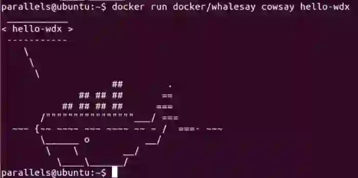 现在,我们来创建一个 ubuntu:14.04 的容器 docker run ubuntu:14.04 /bin/echo 'Hello wdx!'(结果如下图所示)