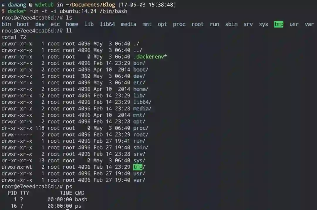 接下来,我们用 docker run -t -i ubuntu:14.04 /bin/bash 可以启动一个 bash 终端用来交互。参数的意思是: