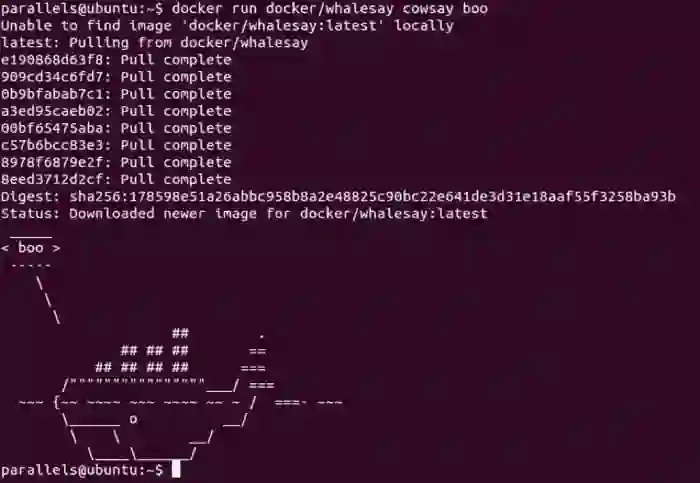 然后我们来运行一下,使用命令 docker run docker/whalesay cowsay boo,其中 cowsay 是要运行的命令,后面的 boo 是参数。