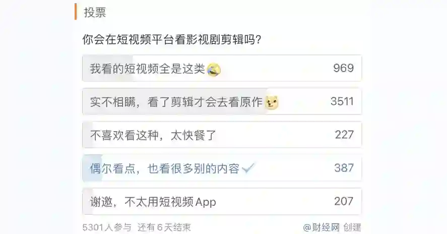 该得票结果反映了一个现实问题:在短视频平台上看影视剪辑内容,已成为部分用户筛选影视内容的主要方式之一。