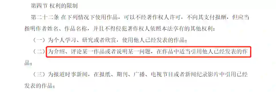 《著作权法》第四节“权利的限制”第二十二条规定,为个人学习、研究或欣赏,为介绍、评论某一作品或说明某一问题,在作品中适当引用他人已发表的作品,“可以不经著作权人许可,不向其支付报酬,但应当指明作者姓名、作品名称,并且不得侵犯著作权人依照本法享有的其他权利”。