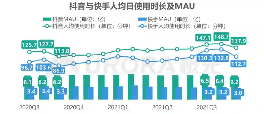 极光大数据显示,在今年三季度中,抖音和快手的用户日均使用时长最高都超过130分钟,远远领先传统长视频平台不足80分钟的日均使用时长。