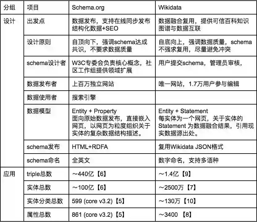 表一:知识图谱schema设计与应用的对比(schema.org,Wikidata)