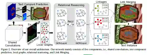 这篇论文提出了一种用于任意形状文本检测的新统一关系推理图网络。在该方法中,局部图通过卷积神经网络桥接了文本提议模型,并通过图卷积网络跨越深度关系推理网络,从而使所提网络端到端可训练。具体而言,每个文本实例将被分成一系列小的矩形组件,并且这些小组件的几何属性(如高度、宽度和方向)将由文本提案模型估算。给定几何属性,本地图构造模型可以大致建立不同文本组件之间的链接。为进一步推理并推论组件与其邻居之间链接的可能性,这篇论文采用基于图的网络对局部图执行深度关系推理。公开数据集上的实验证明了所提方法具有当前最佳性能。