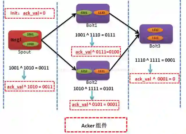 Storm的解决思路,是为每条消息分派一个ID作为唯一性标识,并在消息中包含原始输入消息的ID。同时用一个响应中心(Acker)维护每条原始输入消息的状态,状态的初值为该原始输入消息的ID。每个计算节点成功执行后,则把输入和输出消息的ID进行异或,再异或对应的原始输入消息的状态。由于每条消息在生成和处理时分别被异或一次,则成功执行后所有消息均被异或两次,对应的原始输入消息的状态为0。因此当状态为0后可安全清除原始输入消息的内容,而如果超过指定时间间隔后状态仍不为0,则认为处理该消息的某个环节出了问题,需要重新执行。