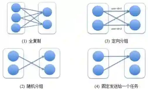 为提高并发性,每一个计算节点对应的数据处理功能被分配到多个任务(相同或不同计算机上的线程)。在设计DAG时,需要考虑如何把待处理的数据分发到下游计算节点对应的各个任务,这在实时计算中称为分组(Grouping)。最简单的方案是为每个任务复制一份,不过这样效率很低,更好的方式是每个任务处理数据的不同部分。随机分组能达到负载均衡的效果,应优先考虑。不过在执行累加、数据关联等操作时,需要保证同一属性的数据被固定分发到对应的任务,这时应采用定向分组。在某些情况下,还需要自定义分组方案。