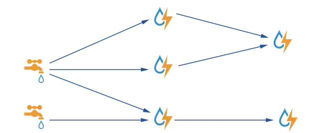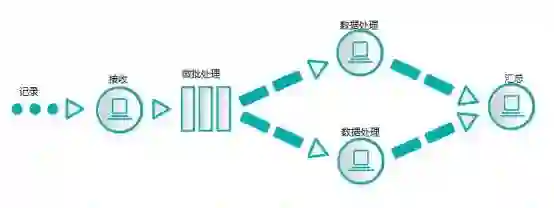 在大数据时代,数据通常都是持续不断动态产生的。在很多场合,数据需要在非常短的时间内得到处理,并且还要考虑容错、拥塞控制等问题,避免数据遗漏或重复计算。流计算框架则是针对这一类问题的解决方案。流计算框架一般采用DAG(有向无环图)模型。图中的节点分为两类:一类是数据的输入节点,负责与外界交互而向系统提供数据;另一类是数据的计算节点,负责完成某种处理功能如过滤、累加、合并等。从外部系统不断传入的实时数据则流经这些节点,把它们串接起来。如果把数据流比作水的话,输入节点好比是喷头,源源不断地出水,计算节点则相当于水管的转接口。如下图所示。