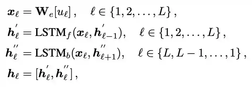 表示第 i 个词,L 表示最大的句子长度,然后使用预训练的 embedding 进行编码,双向 LSTM 进行处理,最终就得到了文本的特征表示