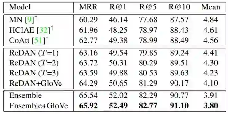 本文使用的数据集是 visual dialog V1.0 (https://visualdialog.org/),评价指标是 NDGC (Normalized Discounted Cumulative Gain),相关实验结果如下:
