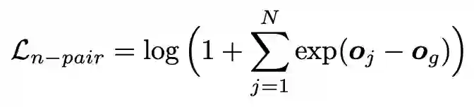 在训练时,本文考虑了两种损失函数,交叉熵和 n-pair 损失,交叉熵好理解,将 o 送个一个分类层,n-pair 损失的计算方式如下:假设第 g 个是正确答案,则损失定义为: