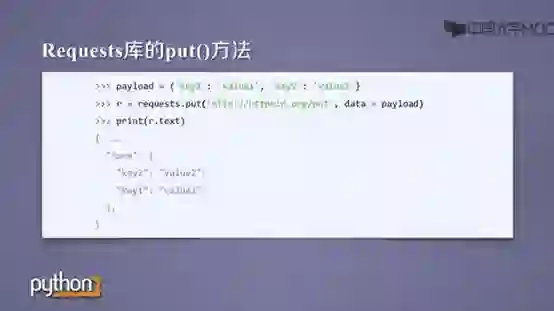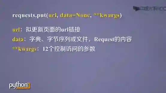 requests.put() 功能则是请求向URL位置存储一个资源,覆盖原URL位置的资源