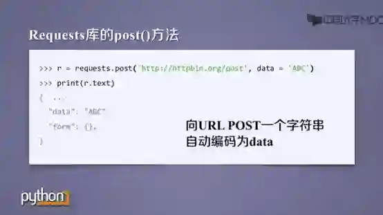 requests.post()为向URL位置后的资源附加新的数据。该数据如果是字典,自动编码为form