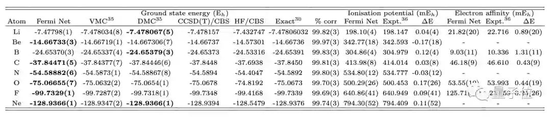 研究人员将FermiNet用在具有10个电子以内的原子上,能量精度均在99.8%左右。
