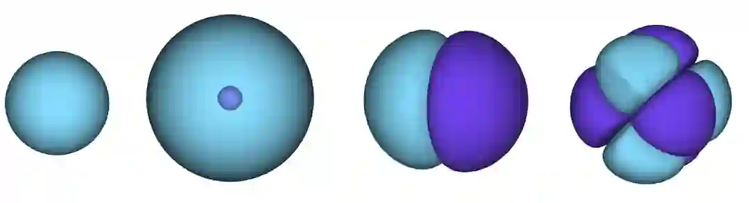 曲面内表示电子出现的高概率区域。蓝色区域波函数为正,紫色区域波函数为负。(注:波函数平方表示电子出现的概率)