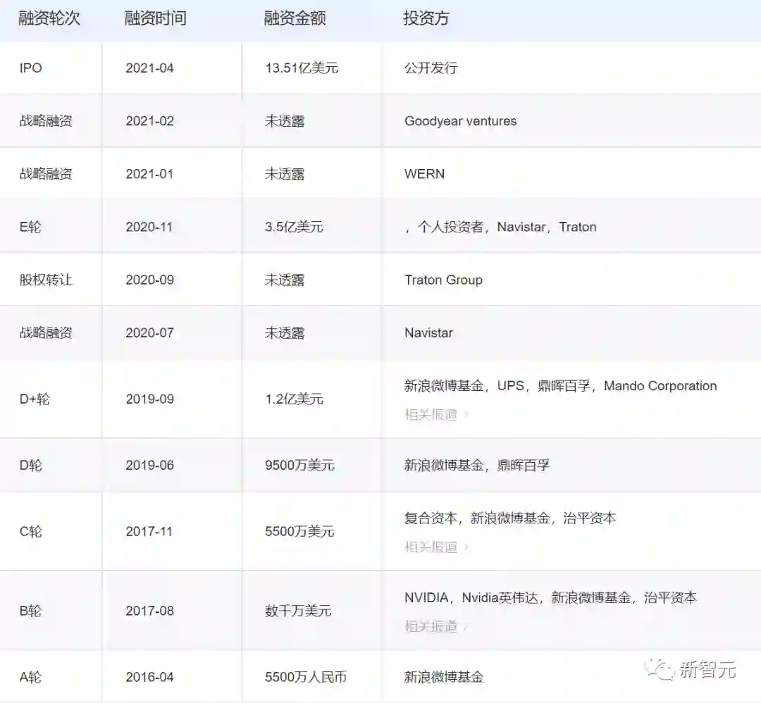自成立以来,图森未来已完成多轮融资,投资方包括UPS、新浪、英伟达等。